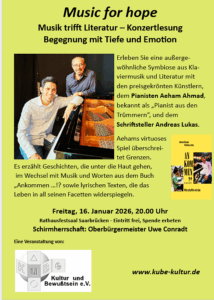 Die Botschaft „Music for hope“ begleitet den Musiker Aeham Ahmad bei seinen Auftritten. Sie führt Schicksale und Menschen zusammen. Dies ins Bewusstsein zu rufen ist auch die Idee der Konzertlesung, die eine Form der Begegnung mit und innerhalb von Musik und Worten bietet, bei der die Zuhörerinnen und Zuhörer mitgenommen werden. Mit Musik und Worten werden Geschichten erzählt.