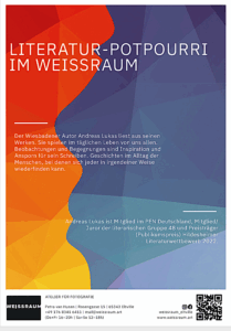Erleben Sie eine Literarische Begegnung bei einem Glas Wein. Ein Literatur-Potpourri aus den Werken von Andreas Lukas, die im täglichen Leben von uns allen spielen. Beobachtungen und Begegnungen sind Inspiration und Ansporn für sein Schreiben. Jeder kann sich in irgendeiner Weise darin wiederfinden